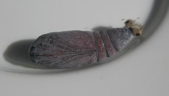 I found this yesterday after having accidentally knocked it loose with the hose from its webbed hiding spot in a corner against the house. It is really purple, the exact same dusty-reddish-purple color that a wine grape gets right before it is fully ripe. I have looked at pages and pages of pupa photos online, but can't figure out what it is! There are red ones, green ones, black ones, brown ones, even some with bright blue spots... but no purple? There is a solution to this, and the solution is putting it in a mason jar (with air flow, of course), to see what it turns into. My guess is a moth or giant beetle... it looks very much like moth pupae online, but also very much like the pupae that the gecko's mealworms morph into (except twice as large, and PURPLE).